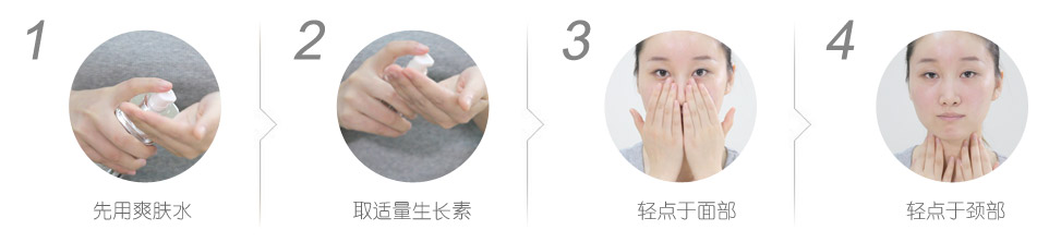 早晚潔膚爽膚后,取適量輕點于面部、頸部輕柔按摩至吸收,是妝前最佳保護品和妝后最佳的補給品。