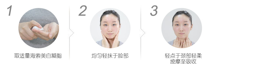 潔膚爽膚后,日間取適量海索美白凝脂1號(hào)均勻輕抹于臉部及頸部,晚間取適量2號(hào)均勻輕抹于臉部和頸部。